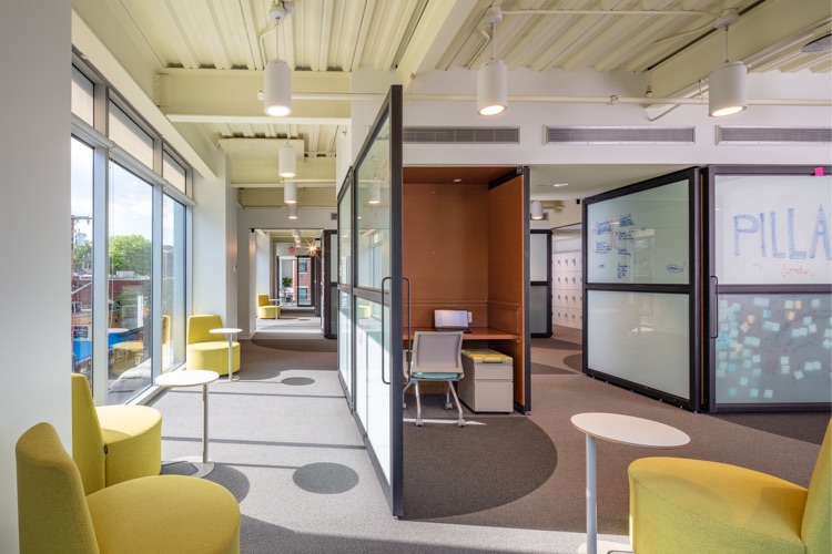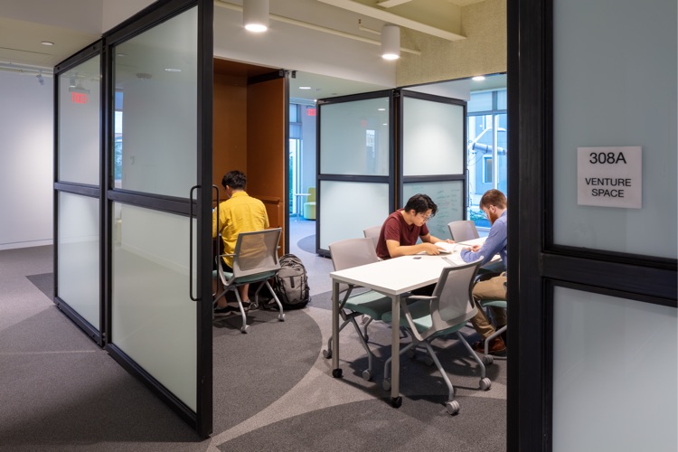Overlooking Thayer Street and southerly views of campus, The Davis Family Venture Lab – generously supported by Chuck Davis ’82 and Jan Davis ’83 – provides beautiful workspace on the top floor of the Nelson Center where teams can come to work and collaborate. Space is available on a first come, first serve basis.